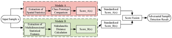 Theoretically, Module A operates on the principle of intra-class feature consistency. It posits that clean samples of a class will cluster around a prototypical representation in the spatial statistical feature space, while adversarial perturbations will cause a deviation. This provides a semantically meaningful measure of abnormality. In contrast, Module B is grounded in the theory of multivariate outlier detection. By capturing higher-order statistical moments and global correlations through the Mahalanobis distance, it sensitively identifies distributional shifts that may not be apparent in the spatial domain alone. The architectural innovation lies in the synergistic fusion of these two complementary perspectives: Module A ensures discriminability based on semantic coherence, while Module B enhances sensitivity to subtle, global distortions.