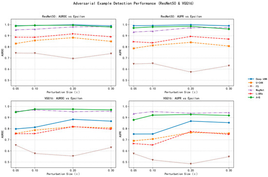 As shown in Table 7, the proposed method maintained high detection performance under traditional attack scenarios. On the VGG16 model, the AUROC for detecting FGSM attacks remained around 0.95 across different perturbation magnitudes. Under PGD attacks, both AUROC and AUPR were close to 1.0, indicating strong robustness against iterative attacks. The C&W attack posed a greater detection challenge due to its distinct optimization objective and generation mechanism; nevertheless, our method still achieved AUROC = 0.7995 and AUPR = 0.7407 on VGG16. For the ResNet50 model, the detection performance was even more remarkable: AUROC and AUPR approached 0.99 for FGSM and PGD attacks. In the case of C&W, the method achieved AUROC = 0.8571 and AUPR = 0.7789, which is significantly higher than random detection levels.