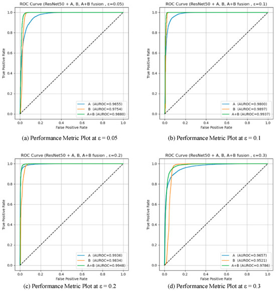 Module B exhibited higher sensitivity to subtle distributional deviations at low perturbation magnitudes, while Module A showed stronger discriminative capability under larger perturbations. At ε = 0.05, Module B achieved a higher AUROC (0.9754) than Module A (0.9655), confirming that Mahalanobis-based global statistics are more effective for capturing fine-grained feature irregularities. However, Module A produced a higher AUPR (0.9527 vs. 0.9357), indicating better stability in precision–recall balance.
