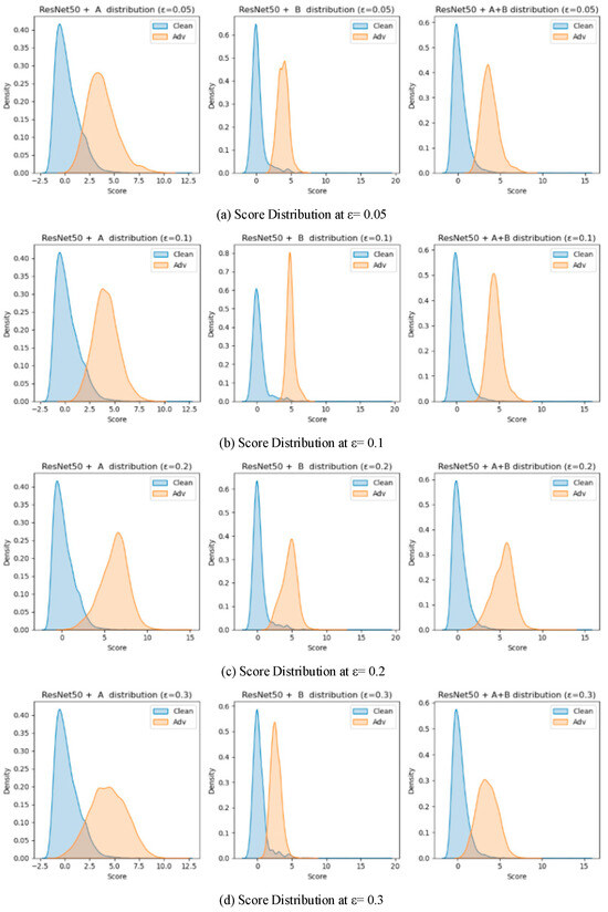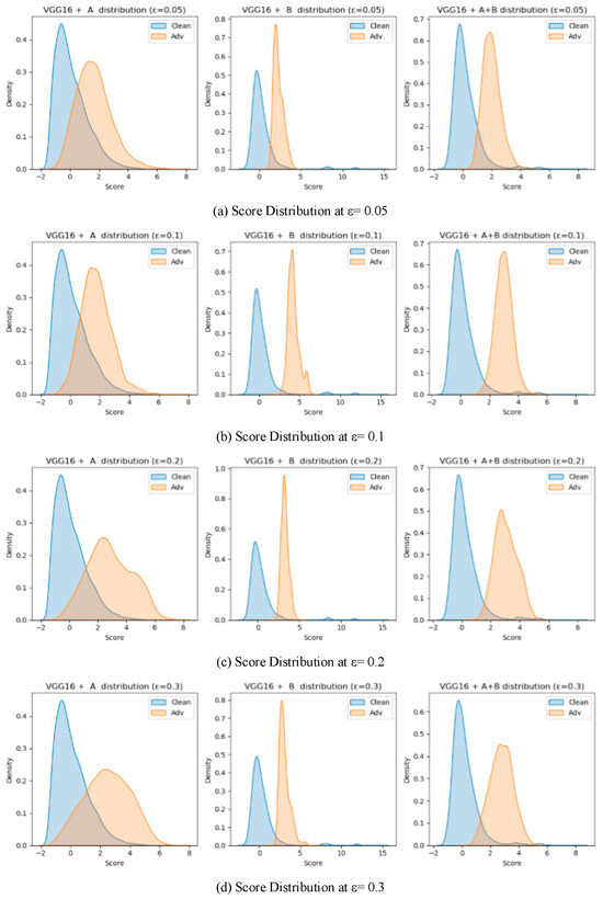On VGG16, the contrast between the two modules was more pronounced due to the shallower architecture and weaker feature separability. At ε = 0.05, Module B achieved AUROC = 0.9475, considerably higher than Module A (0.8365), confirming that high-order statistical modeling is more suited to shallow representations where semantic prototypes are less stable. As ε increased to 0.1 and 0.2, both modules improved, with Module A gradually narrowing the gap (AUROC = 0.8641 and 0.9230, respectively). At ε = 0.3, Module B retained moderate accuracy (AUROC = 0.9668, AUPR = 0.8982) but exhibited larger score overlap, while Module A declined slightly (AUROC = 0.8906) yet maintained better separation stability.