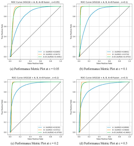 To validate the effectiveness of the two proposed detection modules (Module A: unsupervised detection based on spatial prototype similarity, and Module B: distributional anomaly detection combining multidimensional features with Mahalanobis distance), a systematic ablation study was conducted on two baseline models, VGG16 and ResNet50. Four different attack intensities (ε ∈ {0.05, 0.1, 0.2, 0.3}) were tested, and three configurations were compared: using only Module A, only Module B, and the fused Module A + B. AUROC and AUPR were used as evaluation metrics. The results are summarized in Table 5. And the results are illustrated in Figure 9, Figure 10, Figure 11 and Figure 12, showing the ROC curves and score distributions for each module and their fusion. In these ROC curves (Figure 9 and Figure 11), the dashed line indicates the performance baseline of a random classifier (AUC = 0.5).