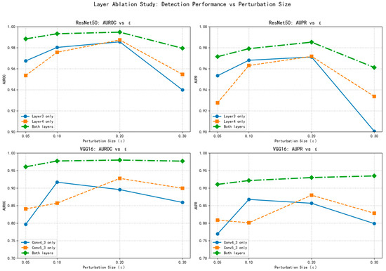 As clearly demonstrated in Table 6, the multi-layer fusion strategy consistently achieves superior performance compared to single-layer configurations. For ResNet50, the combined use of layer3 and layer4 features yields AUROC values ranging from 0.9884 to 0.9948 across different ε values, significantly outperforming the individual layer performances. Similarly, for VGG16, the fusion of conv4_3 and conv5_3 features produces AUROC values between 0.9608 and 0.9800, demonstrating substantial improvements over single-layer configurations.