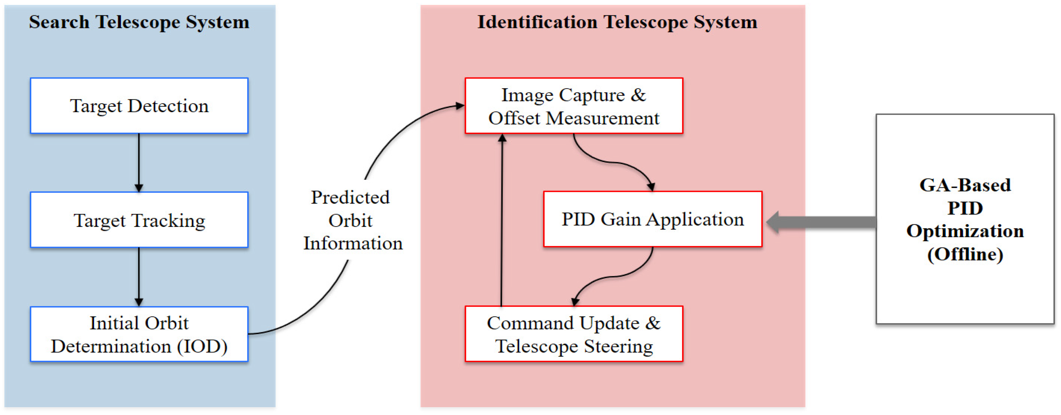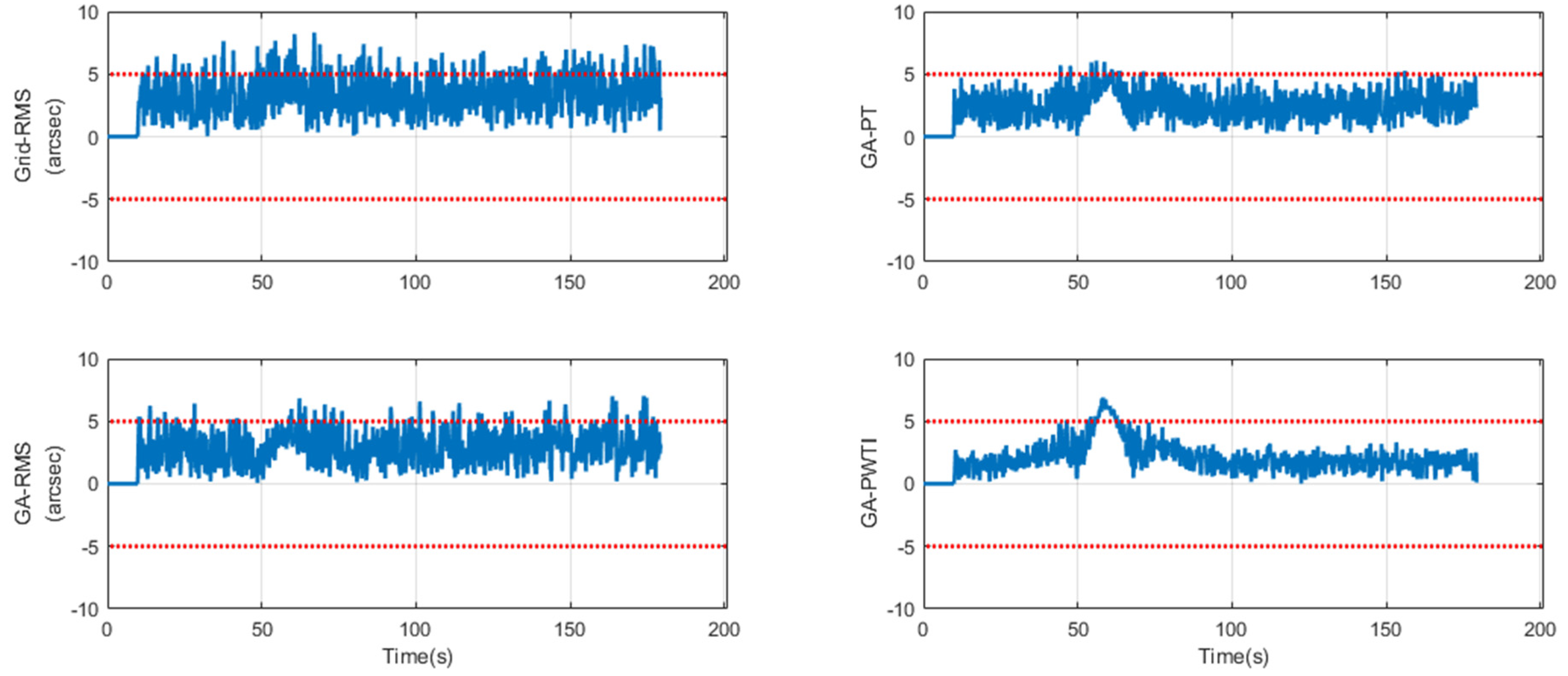 - Hyun, C.; Kim, D.; Kim, H.; Park, S. Genetic Algorithm-Based Proportional, Integral, Derivative (PID) Gain Optimization in an Offset-Compensated Optical Tracking System. J. Space Technol. Appl. 2025, 5, 102–113. [Google Scholar] [CrossRef]