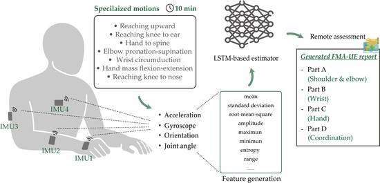 - Yu, L.; Xiong, D.; Guo, L.; Wang, J. A remote quantitative Fugl-Meyer assessment framework for stroke patients based on wearable sensor networks. Comput. Methods Programs Biomed. 2016, 128, 100–110. [Google Scholar] [CrossRef]