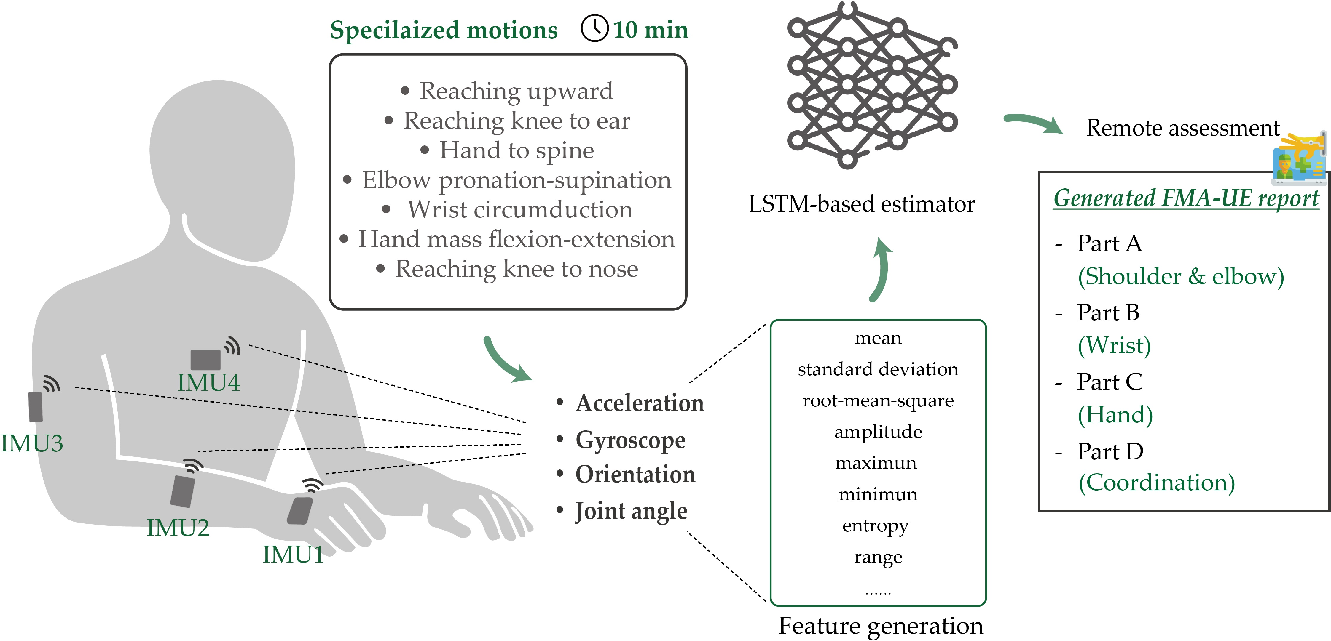 - Zhou, Y.M.; Raman, N.; Proietti, T.; Arnold, J.; Pathak, P.; Pont-Esteban, D.; Nuckols, K.; Rishe, K.; Doshi-Velez, F.; Lin, D.; et al. Estimating Upper Extremity Fugl-Meyer Assessment Scores From Reaching Motions Using Wearable Sensors. IEEE J. Biomed. Health Inform. 2025, 29, 4134–4146. [Google Scholar] [CrossRef]