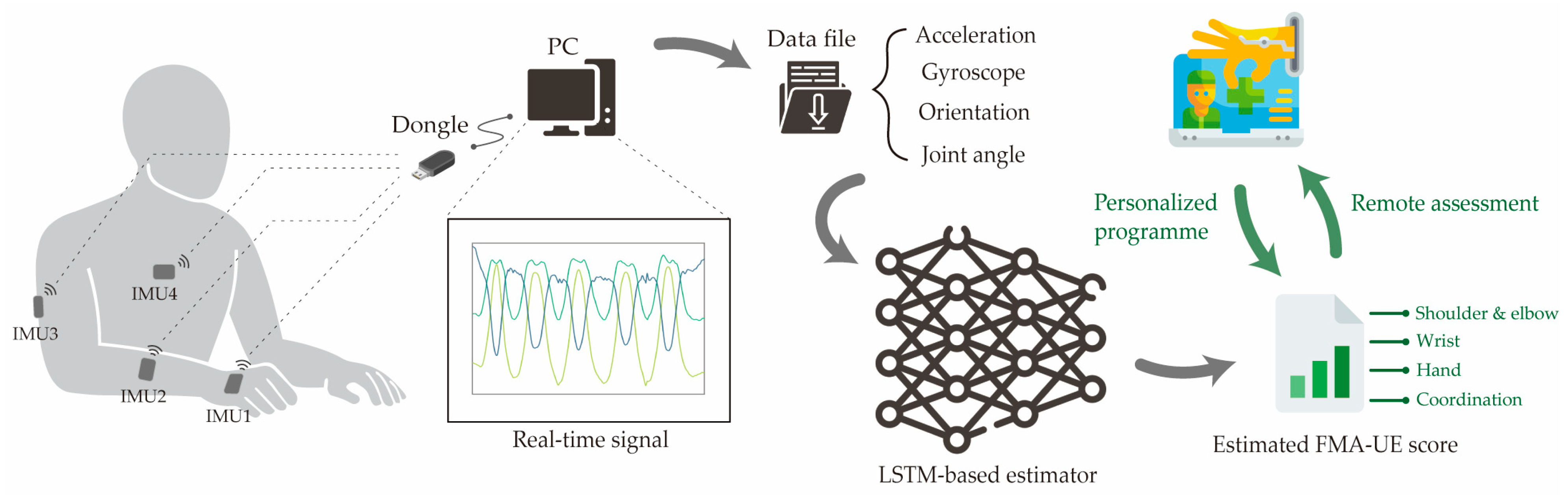 - Zhou, W.; Fu, D.; Duan, Z.; Wang, J.; Zhou, L.; Guo, L. Achieving precision assessment of functional clinical scores for upper extremity using IMU-Based wearable devices and deep learning methods. J. Neuroeng. Rehabil. 2025, 22, 84. [Google Scholar] [CrossRef]