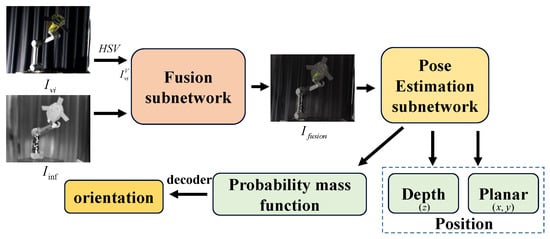 This design not only preserves the high-resolution details of the input image, but also ensures the integrity and consistency of the feature information to generate a high-quality fusion image, which is then recombined with I v i H and I v i S and converted to RGB image I f u s i o n , as shown in Equation (3), which is the input to the pose estimation subnetwork.