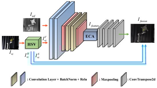 Let I i n f R H × W × 1 and I v i R H × W × 3 represent infrared images and visible images of the space non-cooperative object respectively, and input images are assumed to be registered well. As shown in Equation (1), I v i is converted to the HSV color space.