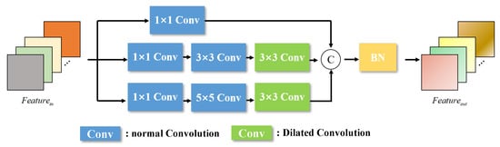 The first branch primarily includes a convolutional layer with a 1 × 1 convolution kernel, responsible for extracting low-level features. The second branch comprises three convolutional layers with convolution kernels of 1 × 1, 3 × 3, and 3 × 3, respectively. Notably, we employ dilated convolution [48] in the last layer to expand the receptive field and capture a broader range of spatial information. In the third branch, we utilize convolutional layers with convolution kernels of 1 × 1, 5 × 5, and 3 × 3, respectively, and the last layer is also a dilated convolution. Subsequently, by concatenating the feature vectors output from the three multi-scale convolution branches and applying BatchNormalization, we achieve a richer and more robust feature representation.