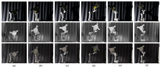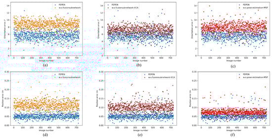 Notably, the ablation study reveals that removing the fusion subnetwork from VIPE severely compromises its performance on the BVPE-Dark dataset, rendering the model unable to extract meaningful pose information or achieve convergence. As demonstrated in Table 6, this finding underscores the critical role of the fusion network in estimating poses of non-cooperative targets under low-illumination conditions. More importantly, these results provide empirical evidence that incorporating infrared imagery effectively compensates for the inherent illumination sensitivity of visible-light images, thereby enhancing the robustness of pose estimation in challenging lighting environments. In addition, in order to visually display the results of the ablation experiment, scatter plot Figure 15 was drawn, where (a), (b), and (c) showed E o r i in different states, and (d), (e), and (f) showed E p o s .