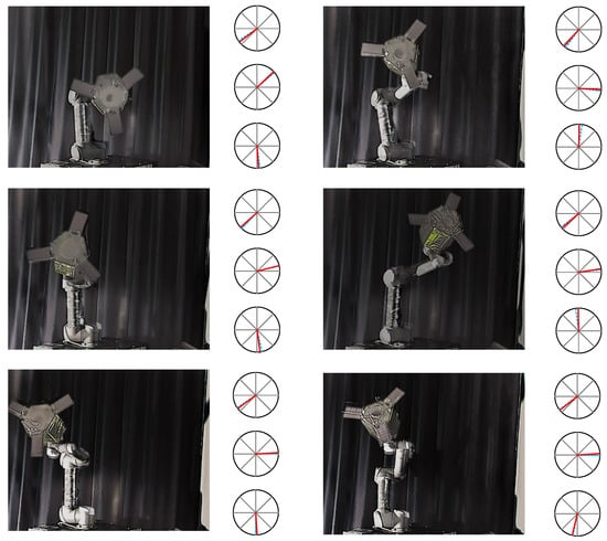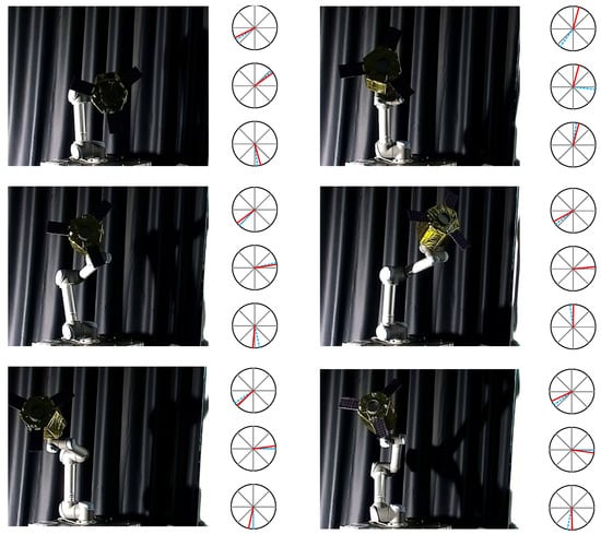 In addition, we show the visual effects of pose estimation for six groups of images, as illustrated in Figure 12 and Figure 13. Figure 12 displays the experimental results of pose estimation using only visible images, while Figure 13 shows the experimental results of pose estimation using fused images as input. The right portion of each image represents the orientation estimates for the X, Y, and Z axes in polar coordinates, with the dashed blue line indicating the true value and the red line indicating the predicted value.
