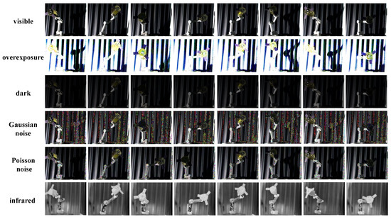 Figure 16. Four perturbations are added to the visible images in the BVPE dataset. From the first row to the last row, they are the original visible images, with overexposure perturbation added, dark environment perturbation, Gaussian noise, Posson noise, and infrared images respectively.