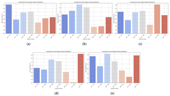 Bar plots show the mean absolute error (MAE) across different ranges of trunk velocity values resulting from five machine learning models: (a) LightGBM, (b) XGBoost, (c) HistGradientBoostingRegressor, (d) GradientBoostingRegressor, and (e) StackingRegressor. Lower bars indicate higher accuracy, while higher bars represent higher prediction error at specific motion ranges. This visualization highlights the robustness of the model and its sensitivity to extreme values. Results are presented for the rotation task.