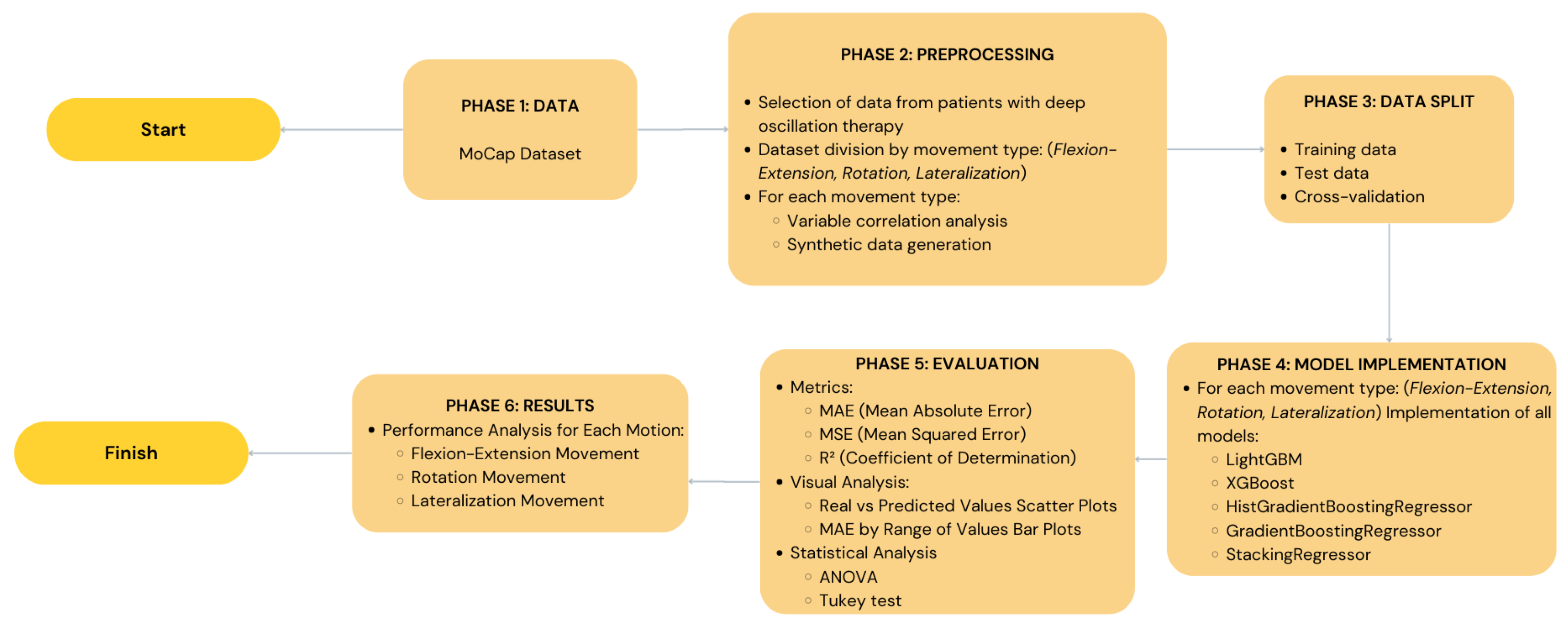 8], which contains three populations: healthy controls, patients who had a routine physical convention, and patients who had deep oscillation therapy. For this study, we focused exclusively on the deep oscillation therapy group, as these patients underwent a structured rehabilitation protocol with repeated mobility assessments in three stages (before, during, and after therapy). This provided longitudinal and clinically relevant mobility data, making it the most suitable subgroup to evaluate the ability of machine learning models to predict trunk movement during rehabilitation. The full sample included 77 individuals in Imbabura, Ecuador (aged 18–65 years and of both sexes), composed of 40 pathological subjects with acute, subacute, or chronic low back pain and 38 asymptomatic controls. Exclusion criteria excluded individuals who had undergone physical or pharmacological therapy within the previous 6 months prior to data collection. Over a 6-month period, participants were encouraged to perform repeated axial exercises, which were processed using motion capture technology, entering 2160 samples from individuals during and after 12 deep oscillation therapy sessions using three functional movements: