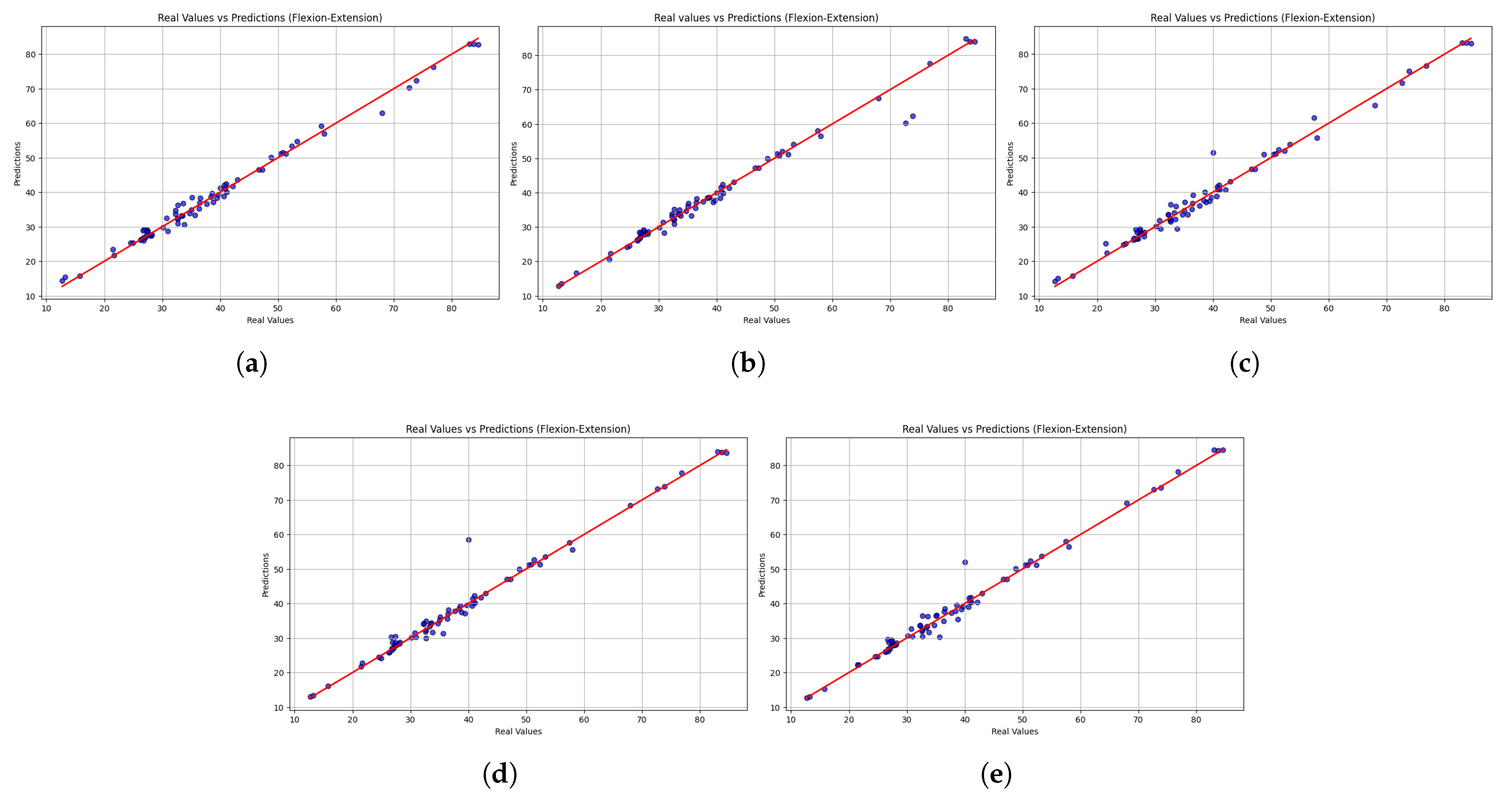 Figure 3 indicate that all five models were able to predict the observed values of the flexion–extension movements. Overall, the predictive reliability of the models was evidenced by their alignment with the identity line. LightGBM showed the closest alignment with the identity line and the narrowest dispersion, consistent with its lowest MSE and highest