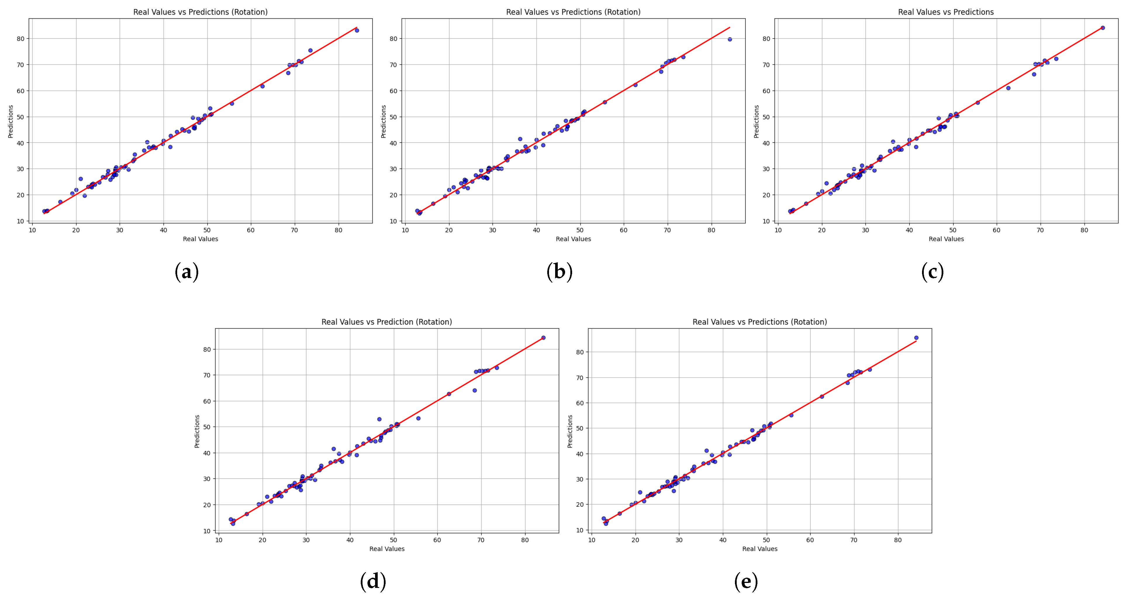 Figure 5 shows the scatter plot comparing the actual and predicted values of rotational motion. The overall accuracy was high, with most models showing predictions consistent with the line of identity. This reliability is seen with LightGBM, which shows the highest and most consistent predictions, indicated by its high