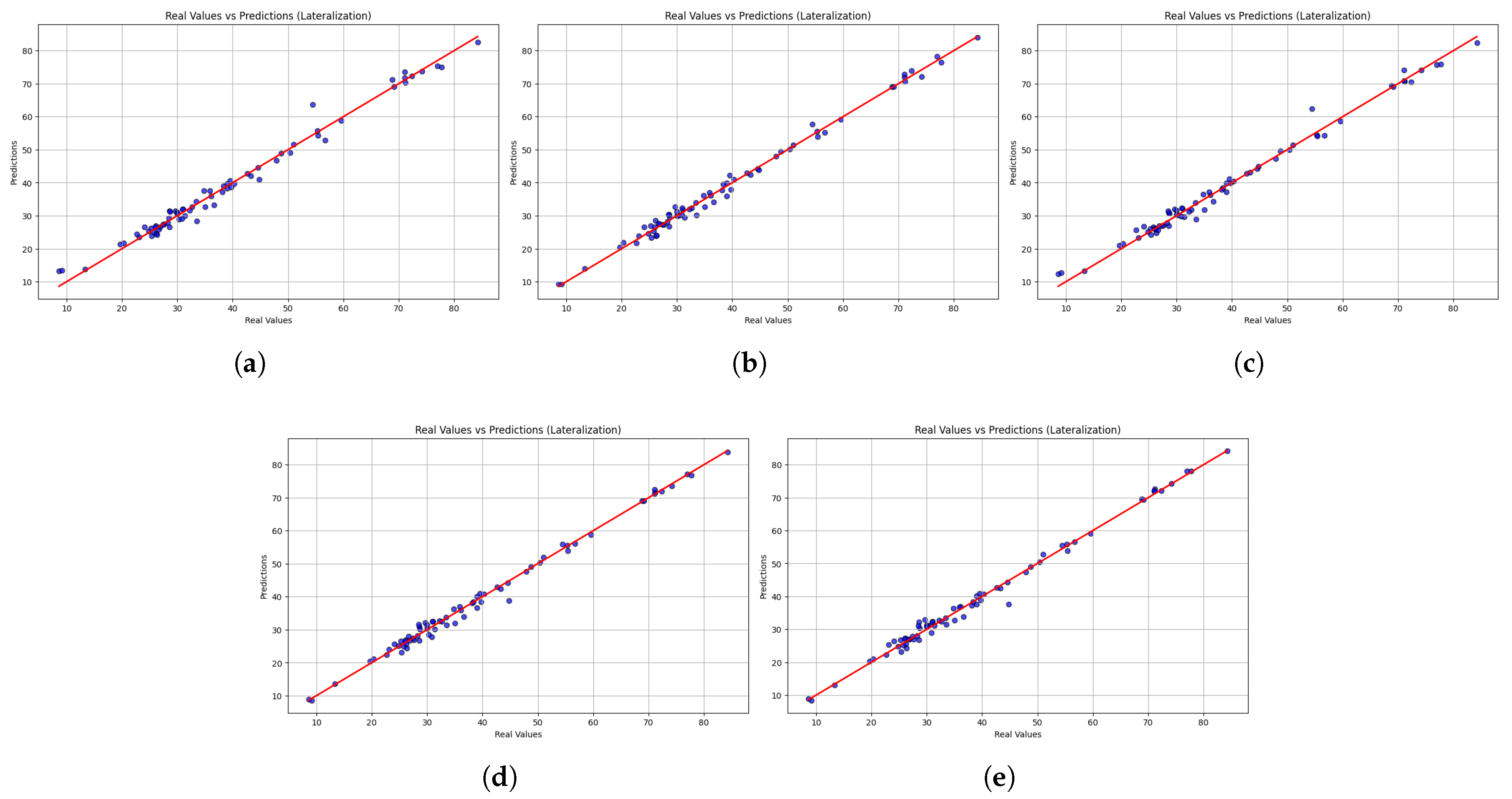 The exceptionally high values observed (up to 0.99) may present a risk of overfitting; however, this potential confounding factor was systematically addressed. For all three cardinal movements, flexion–extension, rotation, and lateralization, our methodology incorporated a robust k-fold cross-validation scheme. Using this method ensured accurate and reproducible separation of the training and test data partitions, justifying the models’ satisfactory performance on a separate subset of the data and confirming the generalization of the learned relationships. Synthetic data amplification was also judiciously employed to reduce the likelihood of model memorization. This was carefully analyzed and implemented to scale the dataset without losing the integrity of the original statistical distributions in the kinematic and kinetic parameters and to be able to work correctly with them. By augmenting the data in a manner that mirrored its inherent structure, the models were compelled to learn the fundamental relationships within the dataset rather than simply memorizing specific instances, which consequently reduced the propensity for overfitting. Despite these robust internal validation strategies, the ultimate generalization of these findings to a broader patient population requires external corroboration. Therefore, external validation of the models using independent clinical datasets is imperative. This final phase of validation is critical to definitively ascertain the models’ capacity to accurately predict mobility outcomes in a new and distinct cohort, thereby confirming their potential for real-world clinical deployment.