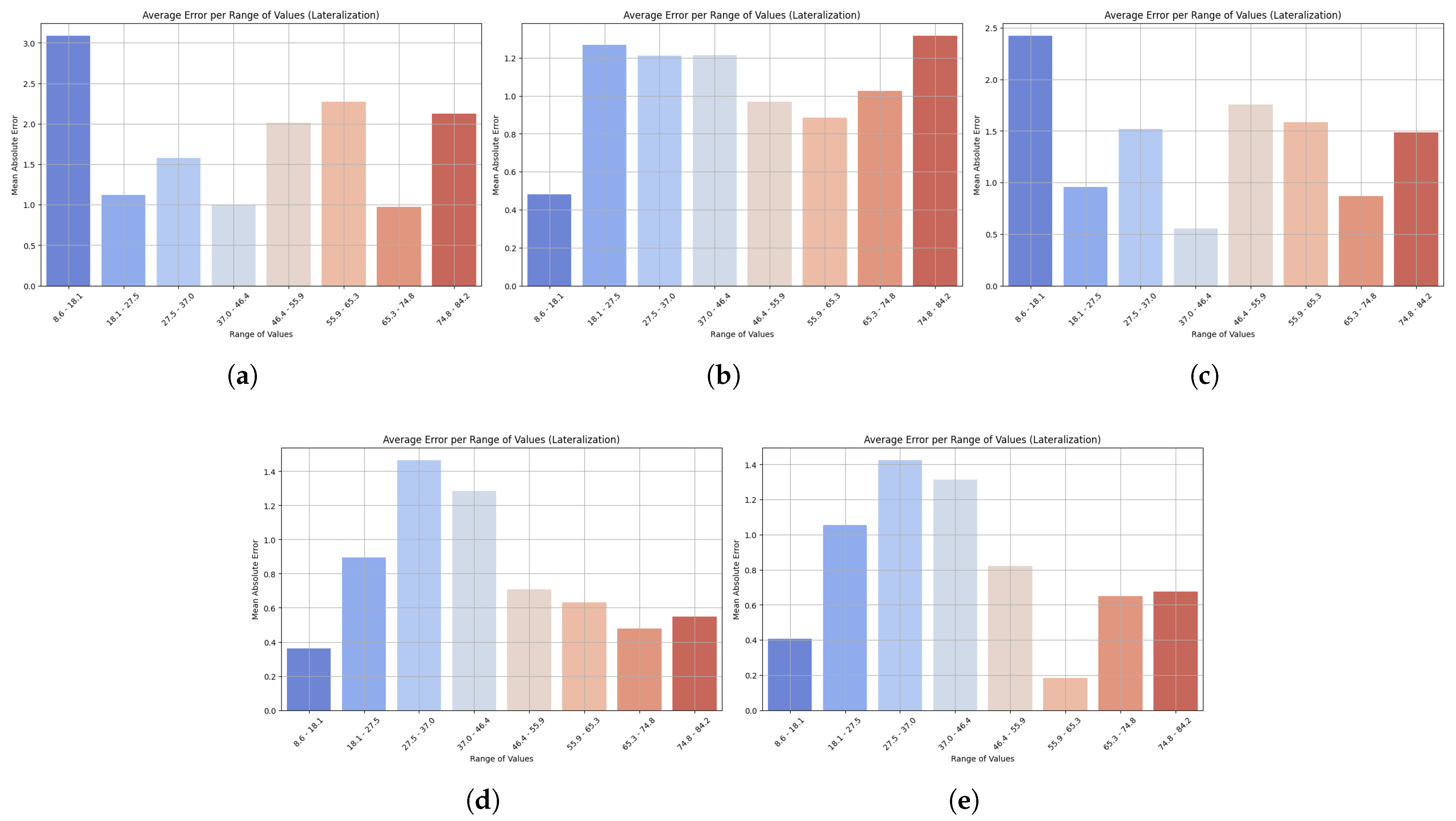 Figure 8 shows the change in MAE across value ranges in lateralization prediction. Across all models, the error was highest at higher ranges, but the value varied across them. LightGBM showed the highest errors at both the low end (6.8 to 14.1) and the upper end, meaning that its performance is poor at both lower and higher values. The MAE was also high at the upper range for XGBoost, and its counterpart, HistGradientBoostingRegressor, exhibited the same trend with increasing errors at higher values. The GradientBoostingRegressor showed minimal MAE at low and medium levels, with only a controlled increase at the high level, demonstrating good generalization. StackingRegressor performed the best overall, with stable, low MAE at low and medium values, which started to curve upwards at high values. StackingRegressor and GradientBoostingRegressor demonstrated consistent performance across the lateralization spectrum, indicating their suitability for reliable monitoring of lateral flexion velocity during rehabilitation. In contrast, LightGBM’s lower accuracy at the extremes of movement limits its clinical utility.