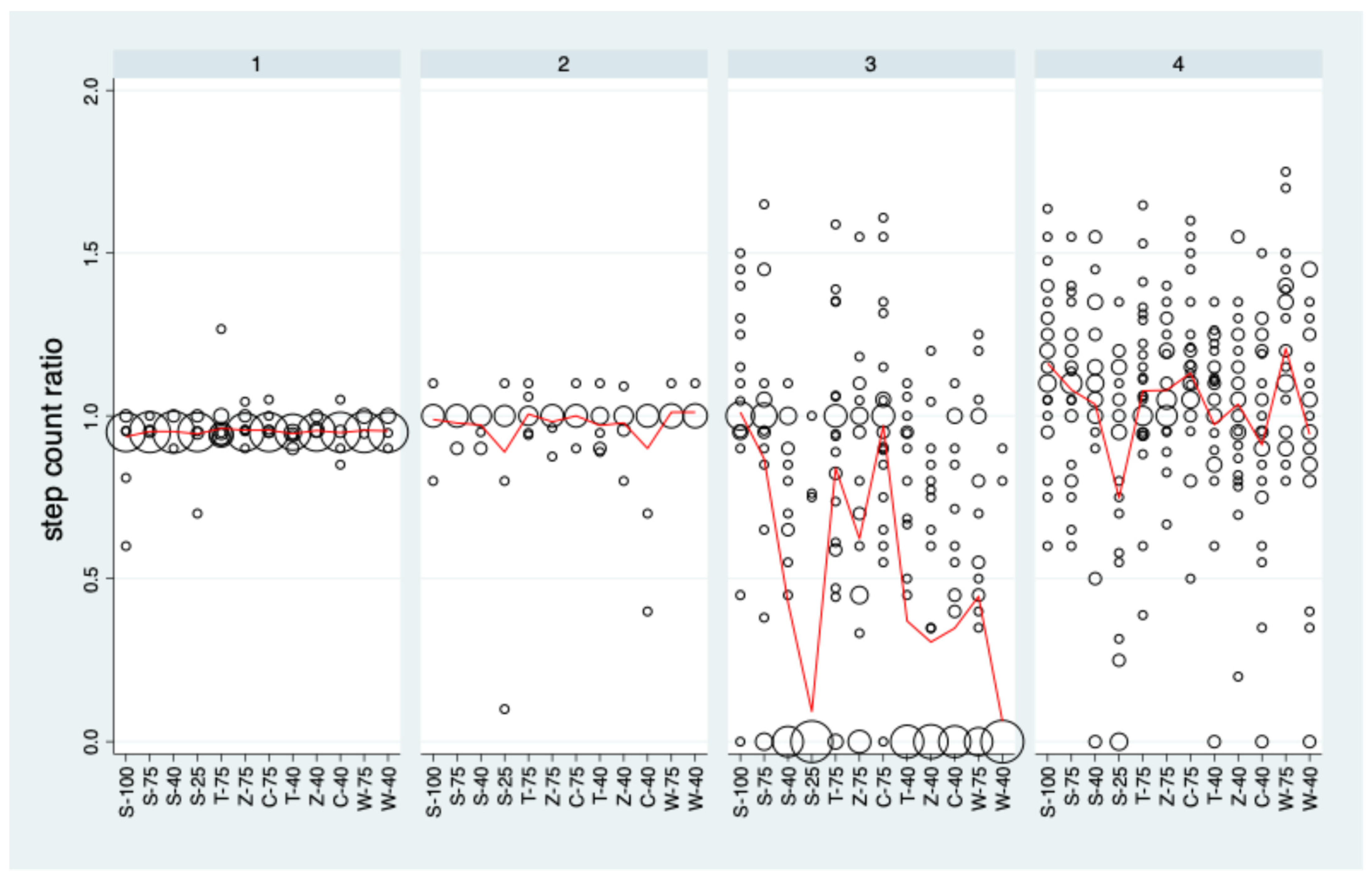 The experimental condition is close to the limit at which the PAT can detect step counts. In this case, we have to expect the step count ratio to be rather unstable and may cover a rather wide range of values.
