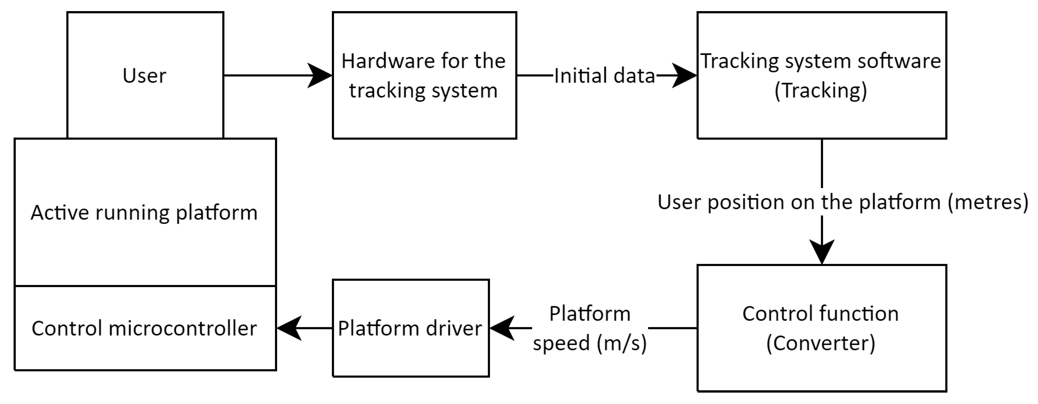 The system includes: the user on the treadmill; a position tracking system (in two configurations—with VR trackers and base stations or based on a computer vision system); a tracking data processing module (Tracking) that computes positional metrics; a converter module (Converter) implementing the control algorithm by calculating the required belt speed based on the user’s position; and the treadmill driver, which receives the target speed and adjusts the engine speed, thereby changing the belt movement speed. The entire chain forms a closed loop: the user’s position is continuously tracked and used to correct the treadmill speed in real time, ensuring adaptation to the walking pace.