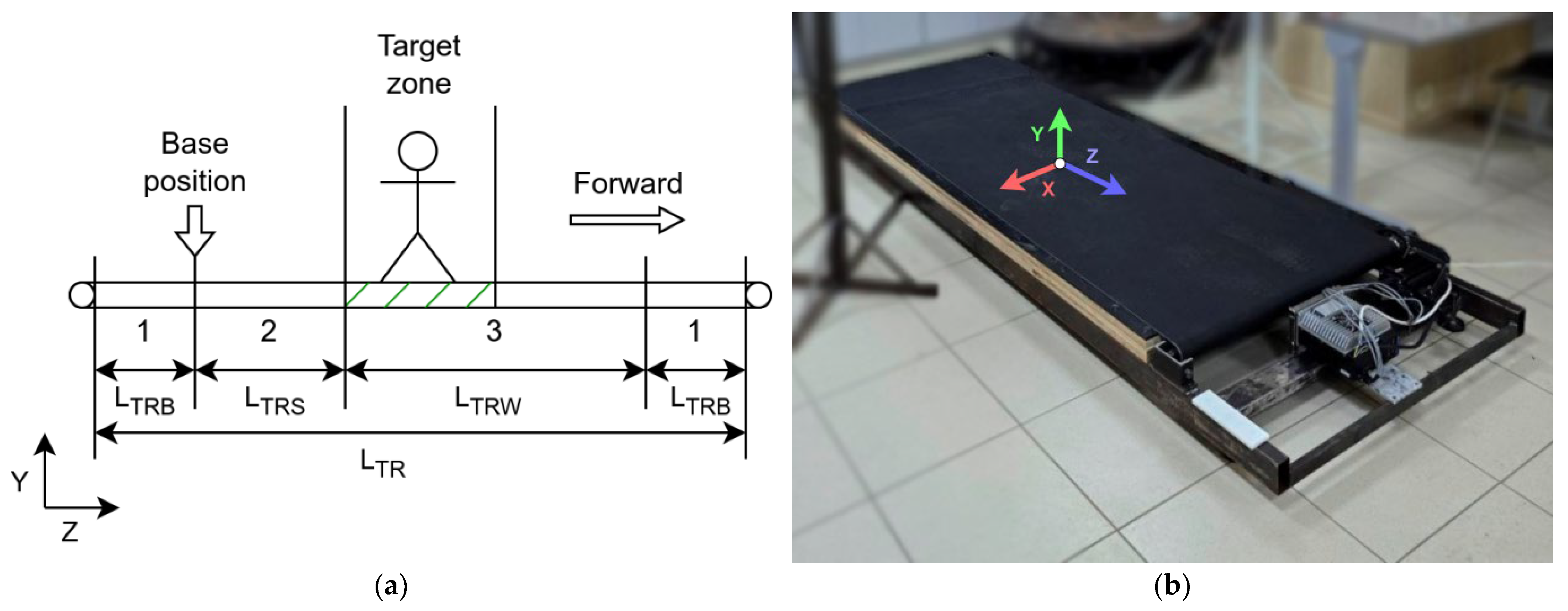 The size of zone (1) is 0.3 m, and zone (2) is determined experimentally and is equal to 0.1 m. Zone (1) is sufficiently large to compensate for the inactive edge of the treadmill and to allow the user to stand comfortably near the boundary. Zone (2) represents a short section of the belt that triggers the platform to stop when entered. Various values were tested during the system setup phase to determine this length. The chosen size (0.1 m) ensures a rapid treadmill stop as soon as the user steps beyond the main working area. Considering Zone (1) of 0.3 m, this provides a total of 0.4 m, which is sufficient for the idle and stop zones, even taking into account the inertia of the treadmill belt.