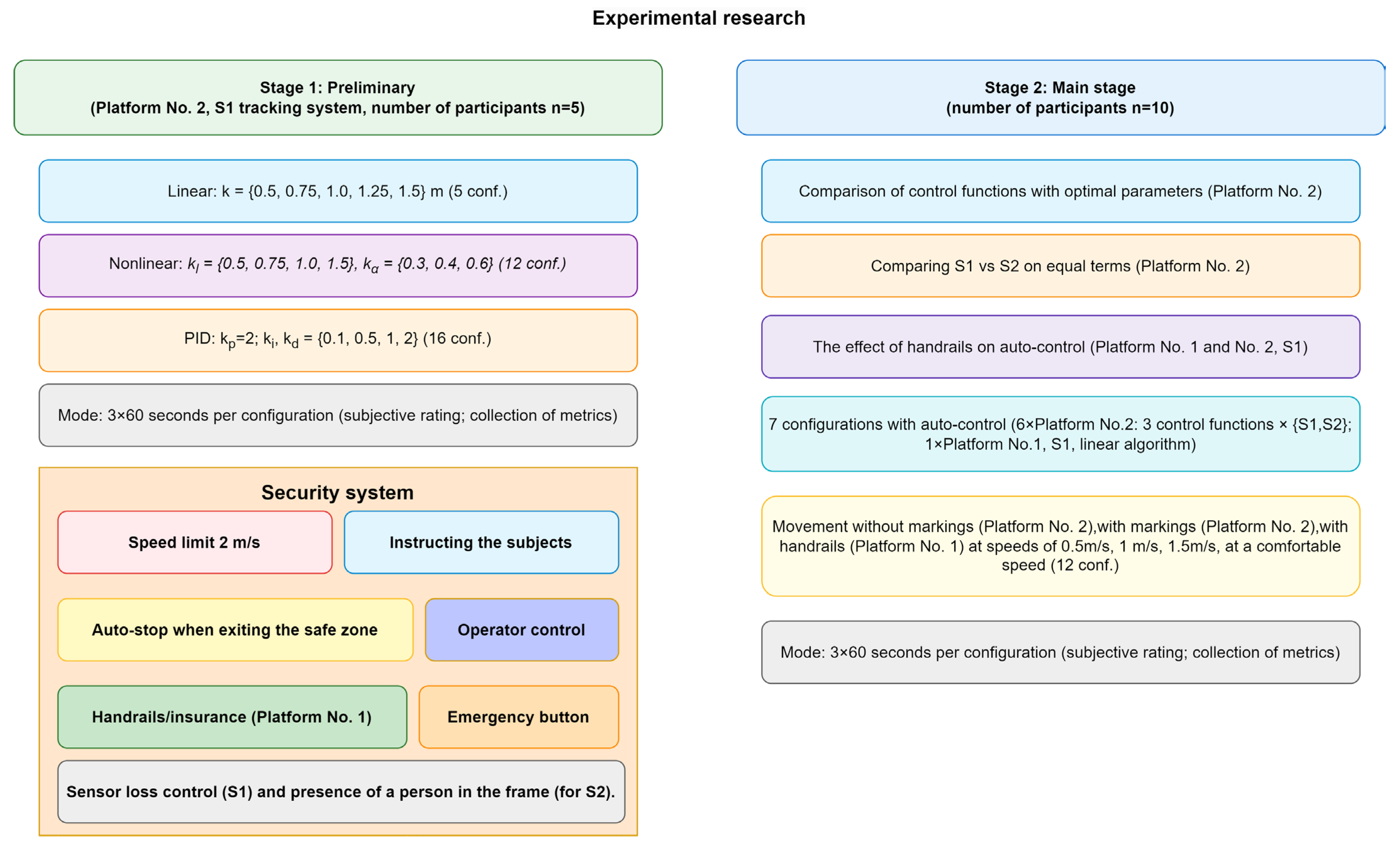 The main distinguishing features between the platforms are their dimensions (the length of the track, which directly affects the working area) and maximum speed, which can provide a radically different user experience. The presence of handrails on platform No. 1 also makes a significant difference to the user experience. Platform No. 1 was previously used to compare different tracking systems and control functions, after which it was found that its length might be insufficient, leading to the creation of platform No. 2, which has different characteristics. The greater length of the platform allows the impact of this parameter on user comfort to be assessed, while the absence of handrails and angle adjustment is due to the orientation of platform No. 2 for musculoskeletal rehabilitation.