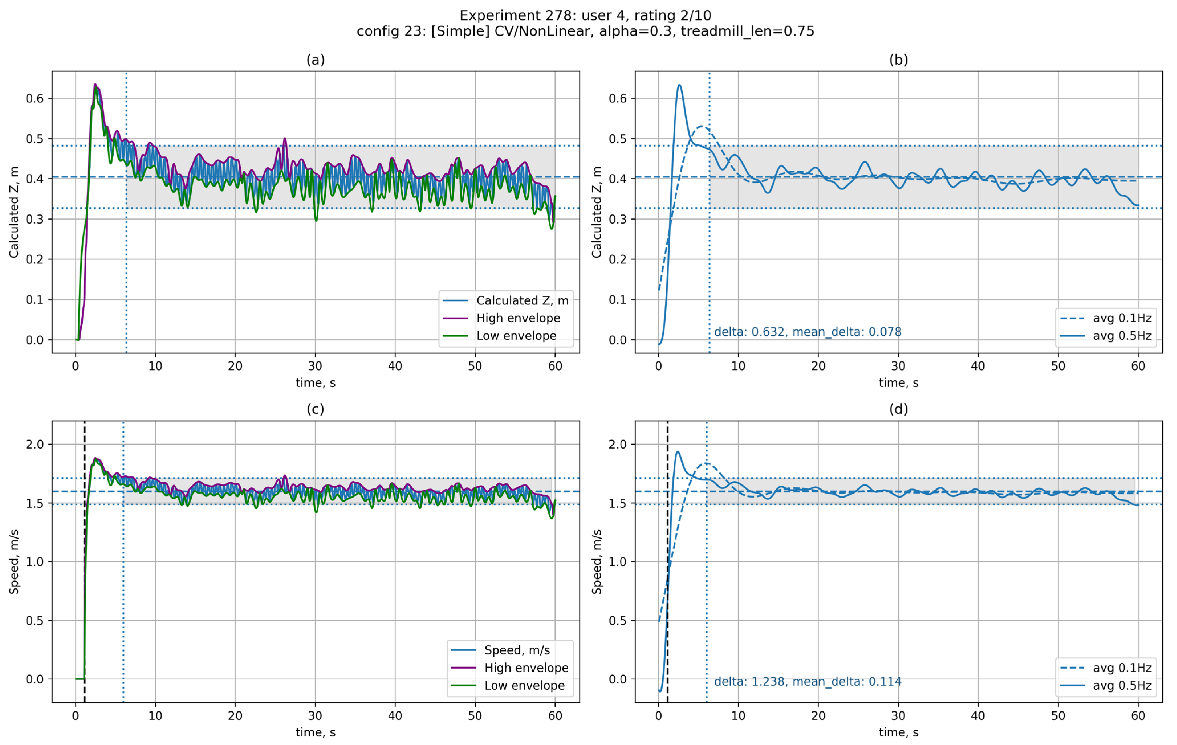 The selected 60 s measurement interval with triple repetitions proved adequate during statistical analysis. Over 60 s, participants consistently reached the steady-state mode, and this time frame was sufficient to compute all metrics used in the study. Moreover, performing three repetitions per configuration yielded stable estimates without significantly increasing fatigue or compromising safety—a particularly important factor during the preliminary stage with extensive parameter tuning. Extending the duration or number of repetitions would have resulted in substantial additional time costs for evaluating and comparing the chosen control function parameters.