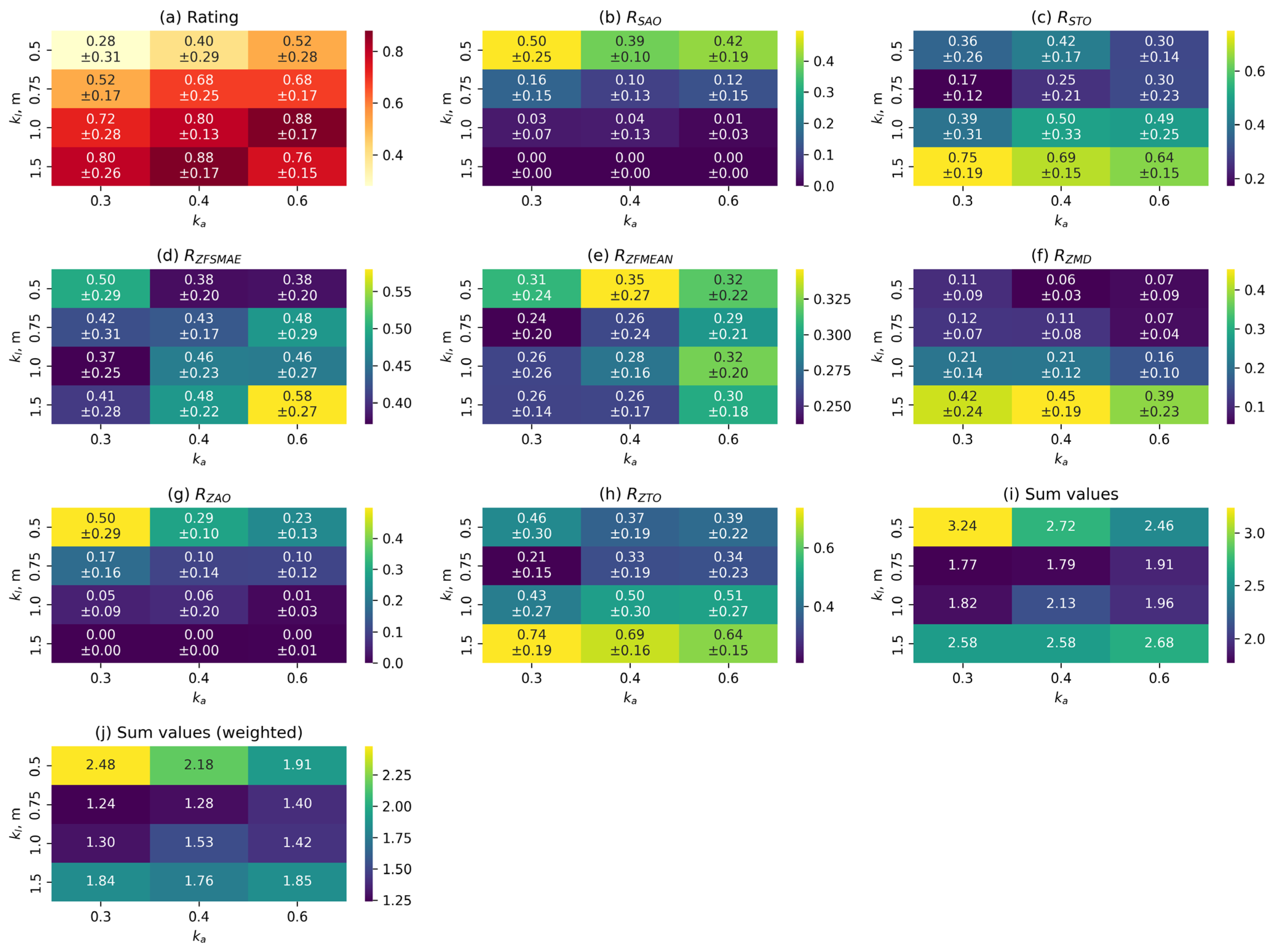 Figure 13 shows heat maps of the weighted sum of metrics for the