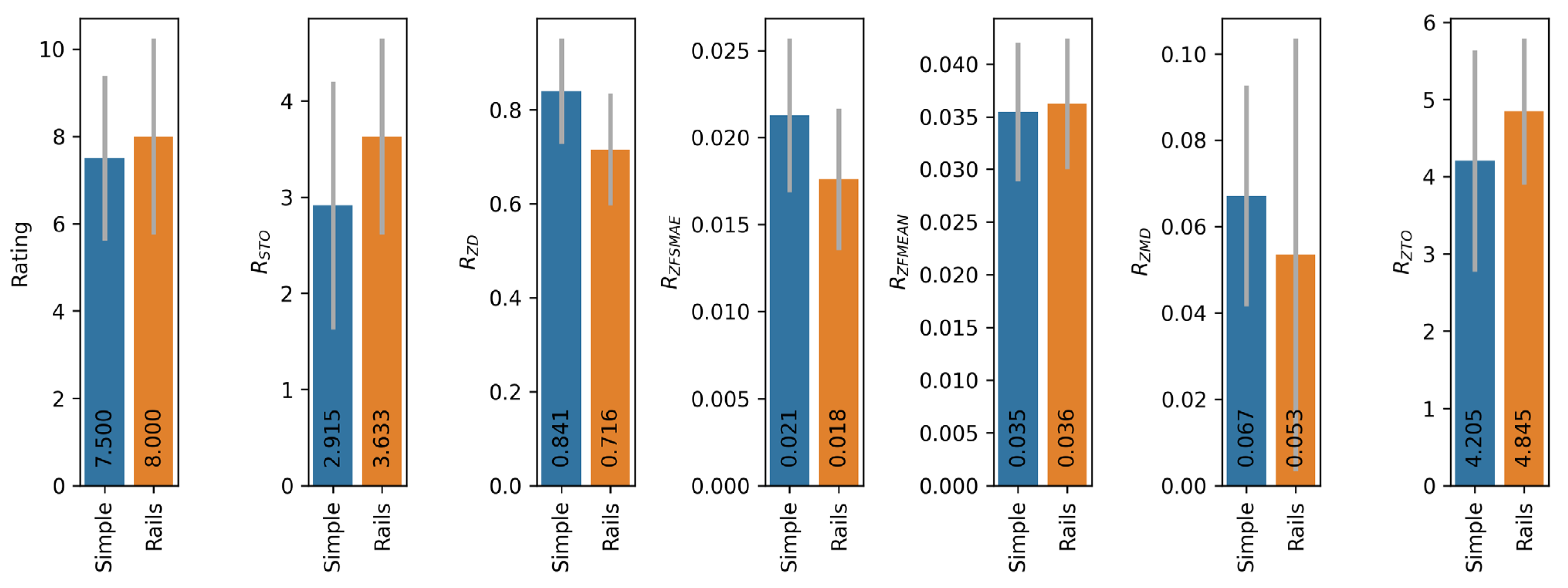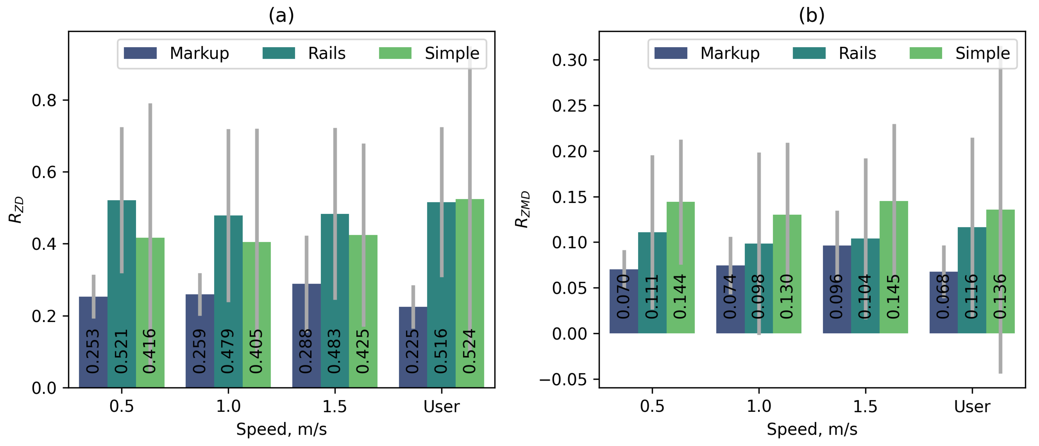 In addition to comparing automatic control functions, a series of measurements were taken during the main stage of the experiment at constant platform speeds: 0.5 m/s, 1 m/s, 1.5 m/s, and at the speed selected by the user. The tests were conducted on three different platform variants: without the use of auxiliary landmarks on platform No. 2 (Simple), with the target zone projected onto the belt on platform No. 2 (Markup), and with the use of handrails on platform No. 1 (Rails). During movement, users tried to maintain a constant position on the platform. Based on the results of these tests, the metrics