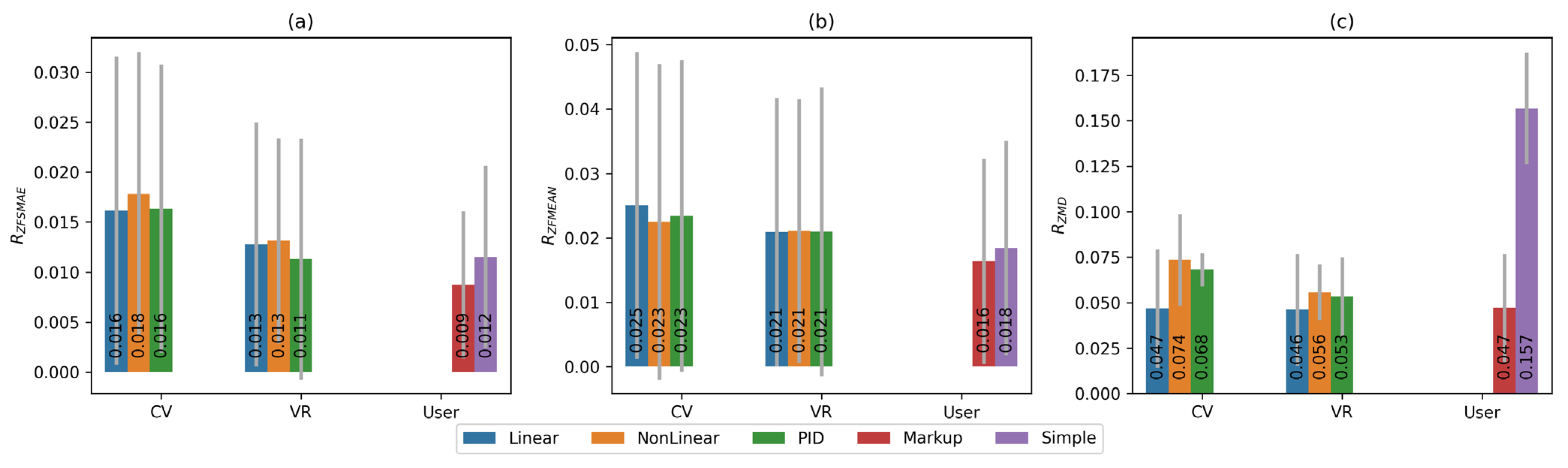 The temporal metrics demonstrated a statistically significant advantage of the linear controller in the VR system compared with the nonlinear and PID controllers (p < 0.05), whereas the spatial metrics proved to be less sensitive to the type of control function.