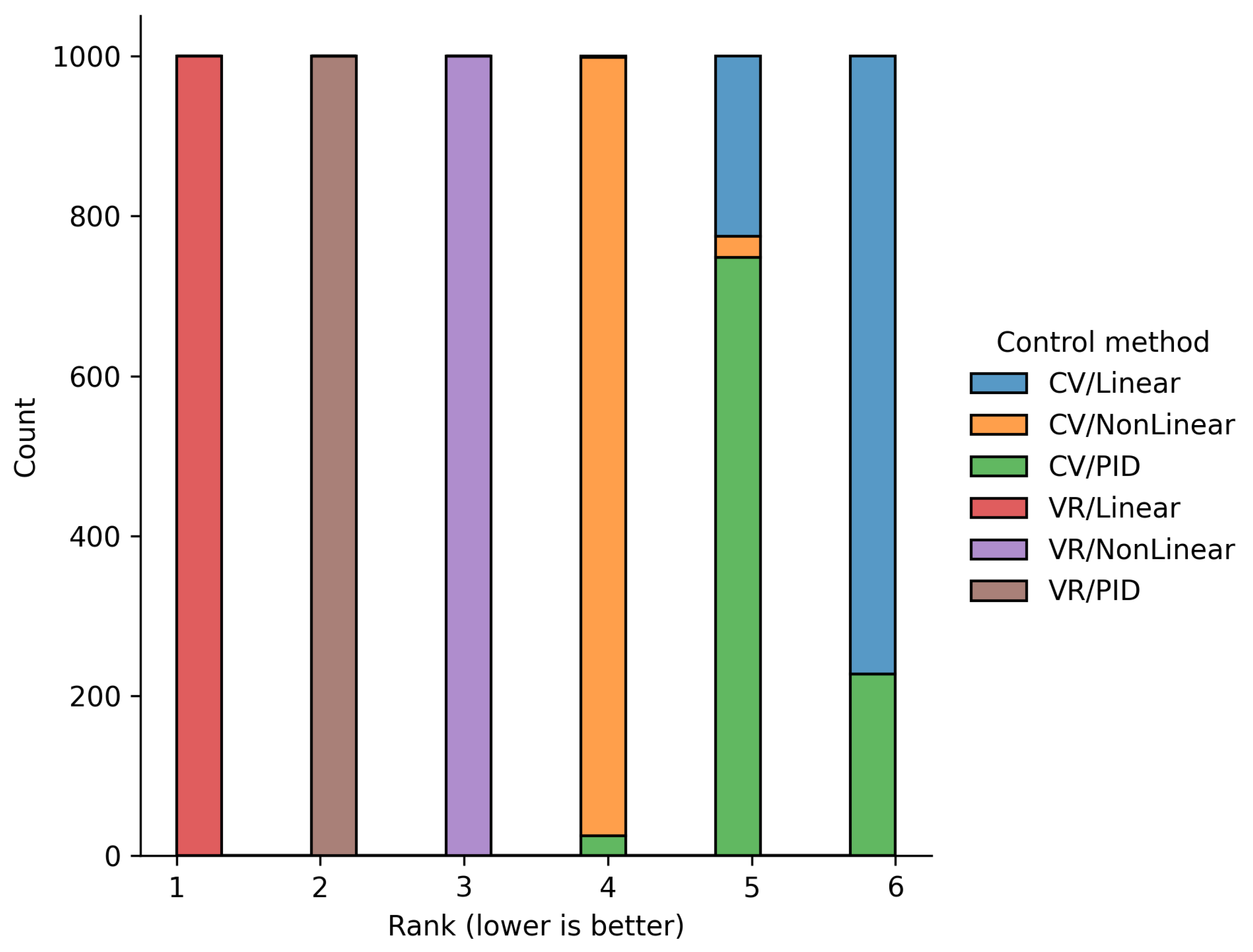 According to the integral rating , the differences between controllers in the VR system reached a high level of statistical significance (p < 0.001), confirming that the structure of the control function has a reliable impact on regulation quality. For the CV system, the effect was weaker (p ≈ 0.1–0.2), which corresponds to the overall increase in data variance when using this type of tracking.