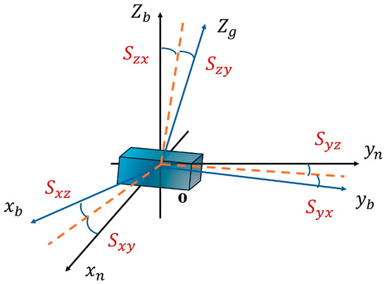 The theory of cross-axis coupling error is represented by coordinate axes, as shown in Figure 2. The deterministic error model constructed in this paper estimates the installation error as one of the core parameters. This means that the model can not only calibrate the inherent errors of inertial devices but also compensate for the installation errors introduced by minor manufacturing deviations of the fixture or long-term wear. Through regular system-level calibration, these parameters can be re-estimated and updated, ensuring that the method maintains long-term stable calibration performance even when the fixture undergoes slow degradation.