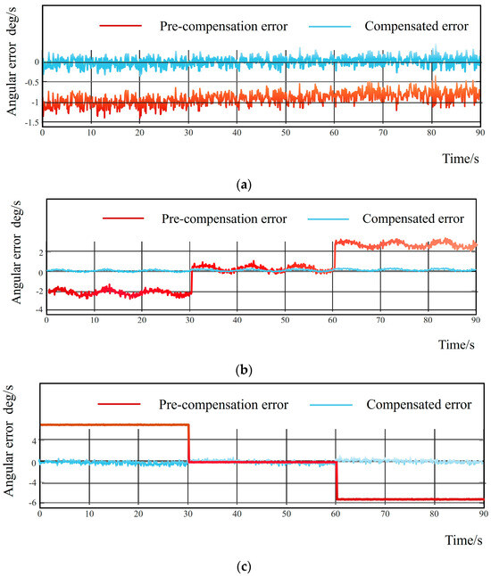 (a) Comparison of roll axis angular velocity accuracies; (b) comparison of pitch axis angular velocity accuracies; (c) comparison of azimuth axis angular velocity accuracies.