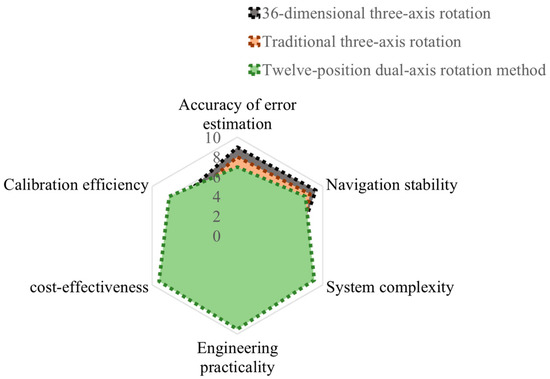 The 36-dimensional three-axis calibration method in reference [9] and the high-precision three-axis calibration experiment in reference [10] were simulated using the MATLAB 2024a software. The system-level calibration was conducted on the collected real MEMS inertial navigation output data and compared with the rotation modulation method proposed in this paper. A comparison of the error parameter estimation accuracy is shown in Table 4. The influence on the long-term navigation performance of MEMS inertial navigation is shown in Table 5. As shown in the radar chart comparison in Figure 8, for the vast majority of tactical-level MEMS inertial navigation systems, the twelve-position dual-axis calibration method proposed in this paper achieves the most outstanding comprehensive balance in terms of accuracy, stability, cost, practicality, and time and is the most valuable and promising solution for engineering applications and promotion.