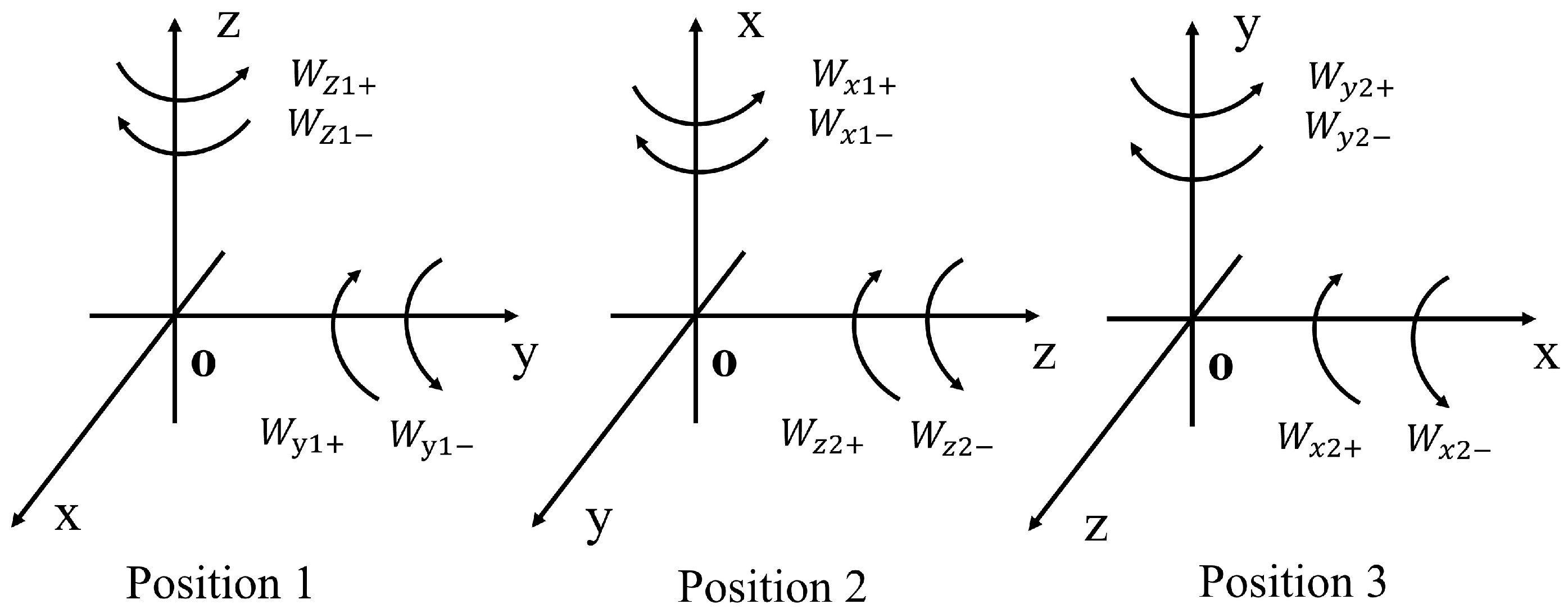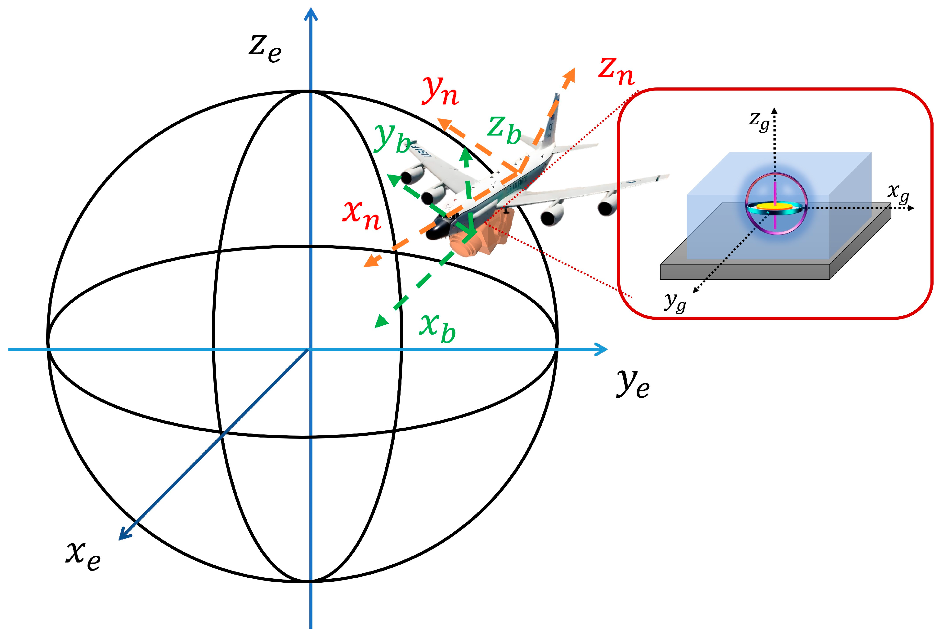 - Establish the MEMS inertial navigation three-axis measurement coordinate system (system g), with the origin being located at the rotation center. The three axes are set according to the actual data manual of the gyroscope. The schematic diagram is shown in Figure 1.