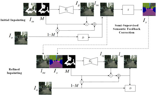 In the final refinement stage of inpainting, the objective is to synthesize a high-fidelity inpainted image, denoted as . A refinement generator, denoted as , is introduced and takes both the initial inpainted image and the corrected semantic map as dual inputs. By leveraging the refined semantic guidance, the inpainting process achieves enhanced structural coherence and visual realism, effectively mitigating semantic inconsistencies present in the preliminary inpainting stage and ensuring the output aligns more accurately with real-world scene semantics.