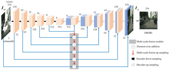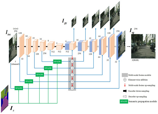 In this formulation, denotes the inpainted output at scale l from the intermediate layers of the generator (refer to the outputs in Figure 7), and represents the ground truth image down-sampled to the corresponding scale l. The supervision provided by on the multi-scale fusion process helps to stabilize training and improve the quality of features learned by the decoder at various scales.