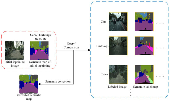 As illustrated in Figure 4, the corrected semantic map derived from the initial inpainting shows that semantic correction for the car (blue) and the sidewalks (pink) on both sides of the road align well with the expected outcomes. This indicates that it is feasible to use relatively reliable and accurate semantic information to correct the semantic errors present in the initial inpainting process. For instance, consider an initial inpainting image featuring a car with uncertain or ambiguous regions. An image selection method is employed to retrieve labeled images of the same category (i.e., “car”) along with their corresponding semantic labels. Subsequently, semantic correction is performed by computing the similarity between deep features extracted from the initial inpainting and those from the selected labeled image.