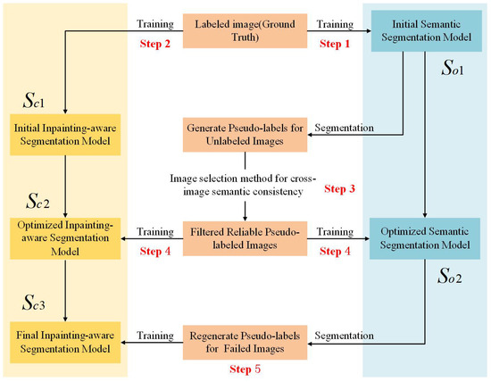 - Semi Supervised Iterative OptimizationStep 4: The initial semantic segmentation model and the inpainting-aware segmentation model are then retrained. This retraining utilizes a combined dataset comprising the original ground-truth labeled images and the previously filtered reliable pseudo-labeled images. This process yields optimized versions of both the semantic segmentation and the inpainting-aware segmentation models.Step 5: Subsequently, the optimized semantic segmentation model (from Step 4) is employed to regenerate pseudo-labels for unlabeled images with initial pseudo-labels that did not pass the validation criteria in Step 3. Finally, the inpainting-aware segmentation model undergoes further retraining, this time utilizing the ground-truth labeled images in conjunction with all currently available pseudo-labeled images.