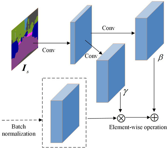 To facilitate effective semantic guidance from , the semantic propagation modules within the refinement network are extended. Specifically, SPADE (spatially adaptive denormalization) semantic propagation modules are integrated into each skip connections of the generator, enabling spatially adaptive feature modulation conditioned on the semantic map. As illustrated in Figure 6, the SPADE module takes two inputs: the semantic segmentation map and the intermediate feature map from the generator network. Internally, SPADE first processes this semantic segmentation map through a convolutional network, transforming it into an embedding space that matches the spatial dimensions of the generator’s feature map. Subsequently, from this embedding, two separate convolutional layers (constituting a linear transformation) predict spatially adaptive scaling factors and offset parameters for each location. These predicted and parameters are then element-wise applied to modulate the normalized intermediate feature map from the generator, effectively performing a conditional denormalization. SPADE dynamically adjusts the feature map of the generative network based on the semantic information at each spatial location, allowing the synthesized image details to better align with the input semantic labels. Consequently, by incorporating spatial information from the semantic segmentation map, the SPADE module facilitates the dynamic adjustment of feature modulation parameters according to the semantic category of each pixel, thereby enhancing the semantic consistency of the generative model and the perceptual quality of the synthesized image.