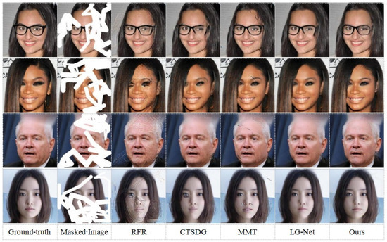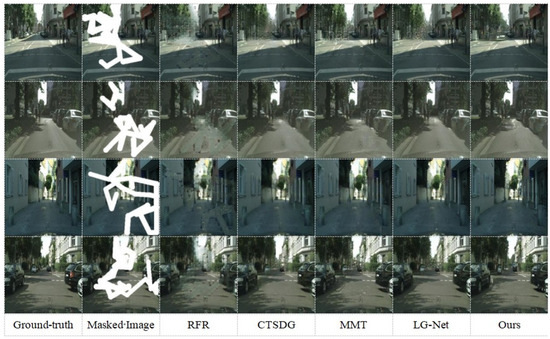 To evaluate performance on the Cityscapes dataset, we similarly employed SSIM, PSNR, and LPIPS as quantitative metrics, with the results summarized in Table 3. The comparative data for RFR, CTSDG, LG-Net, W-Net (W-shaped network) and MDTG (mutual dual-task generator) were all sourced from the experimental findings of Zhang et al. [12]. As with the CelebA-HQ experiments, the MMT results were obtained through our own experimental reproduction.