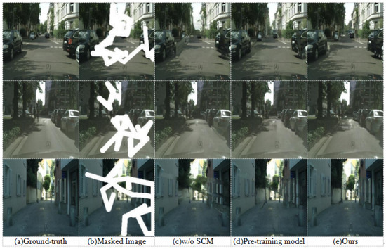 To visually assess the effectiveness of our proposed method and the contributions of its key components, this section presents a qualitative evaluation through ablation experiments. Random masks were applied to images from the Cityscapes dataset to facilitate this comparison. Figure 10 provides a visual comparison of the inpainting results. Each row contrasts the output of our method, labeled “Ours”, with two key ablation studies. The first, “w/o SCM”, represents the outcome when the semi-supervised semantic feedback recorrection module is removed. The second, “Pre-training model”, shows results from using the pre-trained segmentation model for guidance, a configuration consistent with the baseline discussed in Section 4.3.2. The original “Ground-truth” and “Masked Image” are also provided for context. A closer examination of the results in Figure 10 reveals distinct differences in performance among the compared methods, particularly in terms of semantic accuracy and the fidelity of repaired regions. Our proposed algorithm consistently demonstrates superior results, as will be detailed through specific examples below.