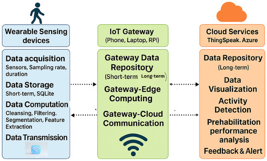 IoT architecture: The system integrates wearable sensors, IoT gateways, and cloud services to enable real-time data acquisition, processing, and feedback for patient activity and performance tracking.