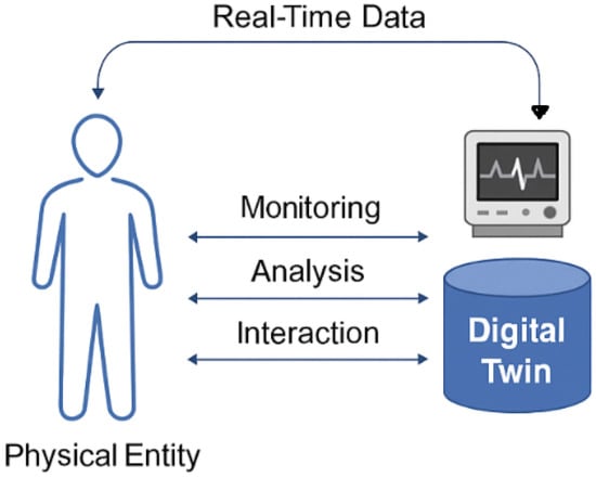 Digital Twin technology has emerged as a transformative innovation across multiple domains, with particularly impactful applications in healthcare and prehabilitation. Qi et al. (2022) [25] provide a foundational overview of DT systems, detailing their architecture, communication protocols, and cross-domain applicability. Other authors have focused on the conceptual development, enabling technologies, and industrial applications of DTs [26]. Figure 2 illustrates the core concept of Digital Twin technology in healthcare. Real-time data from a physical entity such as a patient is continuously captured and transmitted to a digital counterpart. This Digital Twin enables ongoing monitoring, analytical processing, and interactive feedback, forming a closed-loop system that supports personalized and adaptive care.