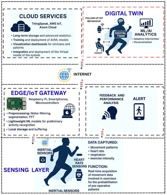 This section presents a multi-layered conceptual framework for IoT-enabled prehabilitation systems augmented by Digital Twin (DT) technology. The framework spans data acquisition, communication, edge/cloud processing, DT modeling, analytics and decision support, and clinical application, as illustrated in Figure 3. It is designed to operate in mixed-mode settings, enabling continuous monitoring, accurate human movement recognition, and personalized interventions [20,21,35].