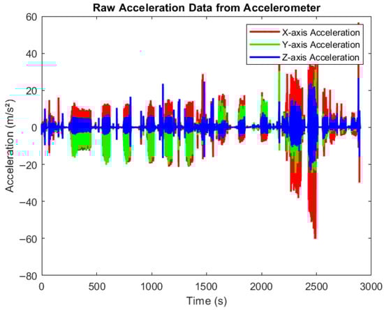Raw data from accelerometer. Time-series plot showing raw acceleration data collected from an accelerometer across three axes: X (red), Y (green), and Z (blue). The x-axis represents time (0–3000 s), and the y-axis shows acceleration values in meters per second squared (m/s2). The signal exhibits dynamic fluctuations and spikes, reflecting different movements pattern in different activities.