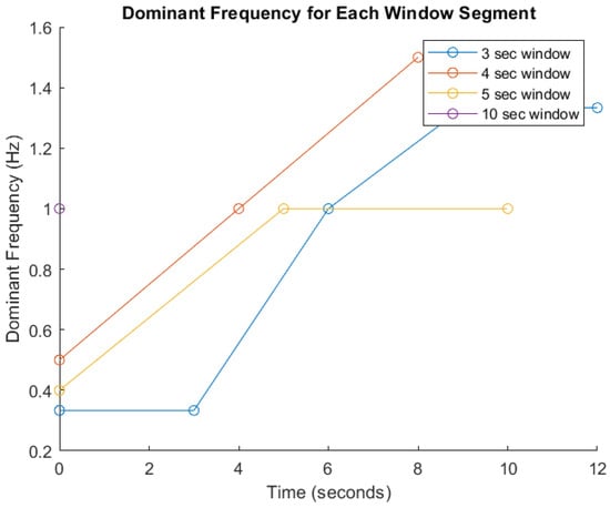 Dominant frequency analysis across segmented time windows. This figure illustrates the variation in dominant frequency over time for different signal segmentation window sizes (3, 4, 5, and 10 s) used in prehabilitation movement analysis. The x-axis represents time (in seconds), while the y-axis shows the dominant frequency (in Hz). Each colored line corresponds to a specific window duration: blue (3 s), red (4 s), yellow (5 s), and purple (10 s).