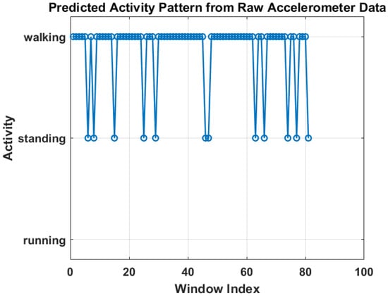 Figure 6 shows the training progress of the LSTM-based activity recognition model. The top graph illustrates the accuracy progression over 1350 iterations, with training accuracy (blue) and validation accuracy (black) both converging toward 100%, indicating strong model generalization. The upper panel presents the model’s accuracy curve for both training and validation datasets, achieving a final validation accuracy of 96.4% after 30 epochs using a constant learning rate of 0.001. Training was conducted on a single CPU over 1 min and 27 s. The lower panel depicts the corresponding loss convergence, where both training and validation losses decrease steadily, reflecting stable learning without overfitting. The overall trend confirms that the model successfully learns discriminative temporal patterns in sensor data, enabling reliable real-time activity prediction within the IoT–Digital Twin framework. On the other hand, Figure 7 illustrates the predicted activity pattern derived from raw accelerometer data using the AI model, where each window index represents a segmented data interval used for classification. The figure shows the alternating predictions between “walking” and “standing,” indicating that the model effectively distinguishes distinct motion states based on temporal sensor features. The consistency of detected activity windows demonstrates stable recognition performance and clear class separation across consecutive time segments.
