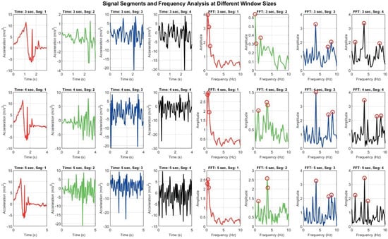 Signal Segmentation and frequency analysis at different window sizes: grid of plots showing time domain signal segments and their corresponding frequency domain representations using FFT across varying window sizes. Each row represents different time window (e.g., 3 s, 4 s, 5 s), while columns display segmented signals and their FFT outputs.