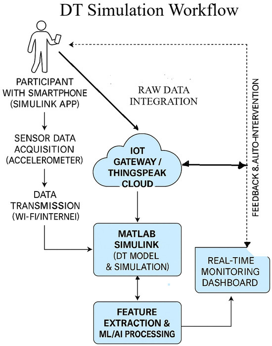 To facilitate real-time sensor data integration within the proposed DT framework, a structured and modular approach was adopted, employing the Simulink Mobile Sensor App in conjunction with the ThingSpeak cloud platform. A schematic overview of the Digital Twin simulation workflow is presented in Figure 9. In this configuration, participants carry smartphones equipped with the Simulink Mobile Sensor app to collect real-time accelerometer data, which are transmitted via Wi-Fi or mobile networks to an IoT gateway or the ThingSpeak cloud platform for ingestion and visualization. The acquired data are subsequently processed in MATLAB Simulink to construct and simulate the DT model, effectively transforming the smartphone into a wearable sensing device. Continuous and reliable data streaming between Simulink, ThingSpeak, and the edge gateway validates robust sensor–cloud integration.